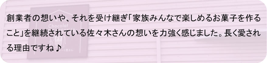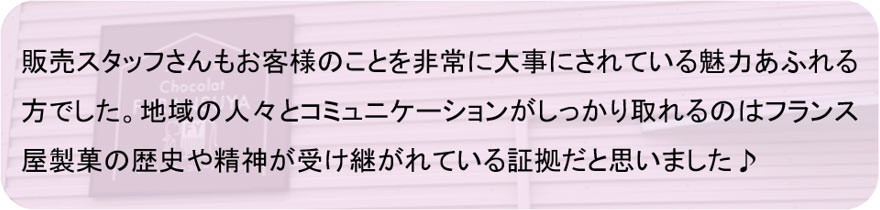 工場兼直売店を初めて2年。少しずつ口コミが広がって、今では他府県の方も、お菓子を買いに訪れてこられるとのことです。それも、明るく笑顔で向かえてくれる販売スタッフさんいらっしゃるからでしょう。笑顔が明るく、素敵な販売スタッフさんは、常連のお客様のお名前は覚えられていて、「○○さん、いつもありがとうございます」 と接客されているとのことです。お客様や地域の方々とのやりとりを大切に、一歩づつ、丁寧に関係を積み重ねられている姿勢が、愛される秘訣なのだと感じました。