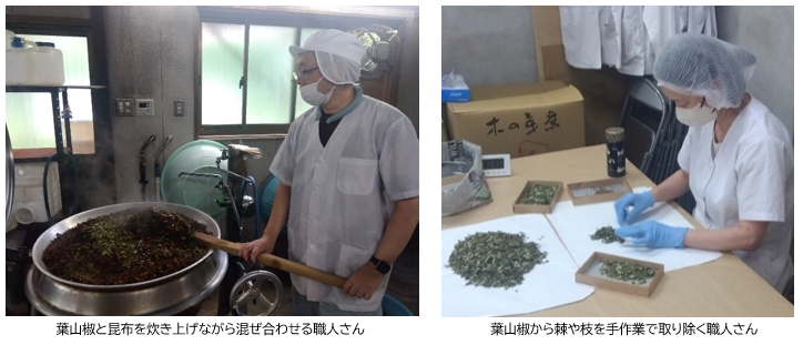 「木の芽煮」と呼ばれる、昆布と山椒を炊き合わせた佃煮は、「くらま辻井」の看板商品だ。「木の芽煮」は、鯖街道の一つでもあった鞍馬街道で、昆布が手に入りやすかったことから、山椒と一緒に炊き上げていたことが始まり。現在、使用する昆布は利尻産、山椒は和歌山や長野などから厳選されたもの。だが、何よりも味を決定づけるのは、鞍馬の空気と水、そして職人さんの“感覚”だという。