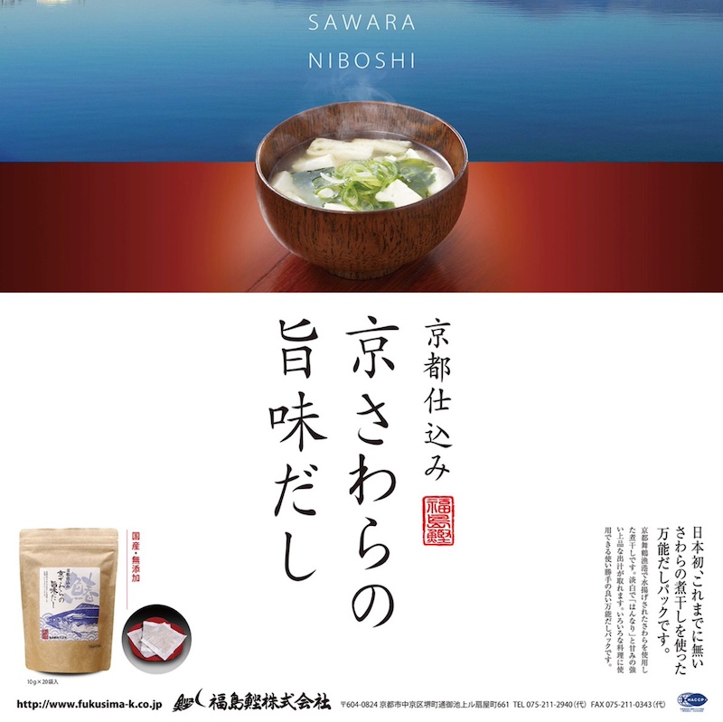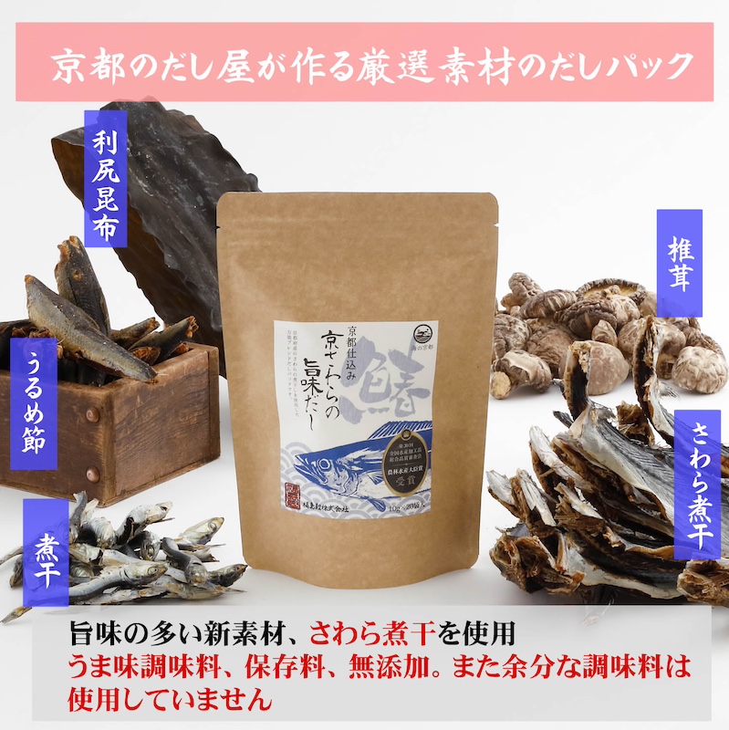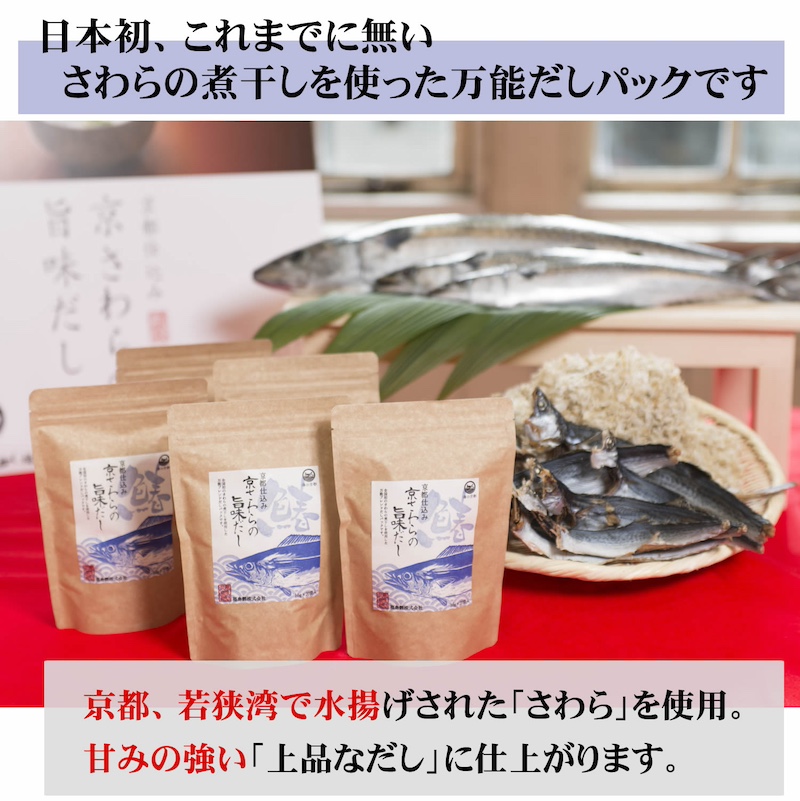 ポイント:さわら煮干しを使用した日本初のだし商品を開発。「純京都産」のさわら煮干に削り節、昆布、椎茸をブレンドすることで更に深い味わいに仕上げました。 ご家庭で簡単にだしを取っていただくことが出来ます。さわらの 煮干、うるめのふし、かたくちいわしの煮干、昆布、乾椎茸を使用。調味料、保存料無添加。