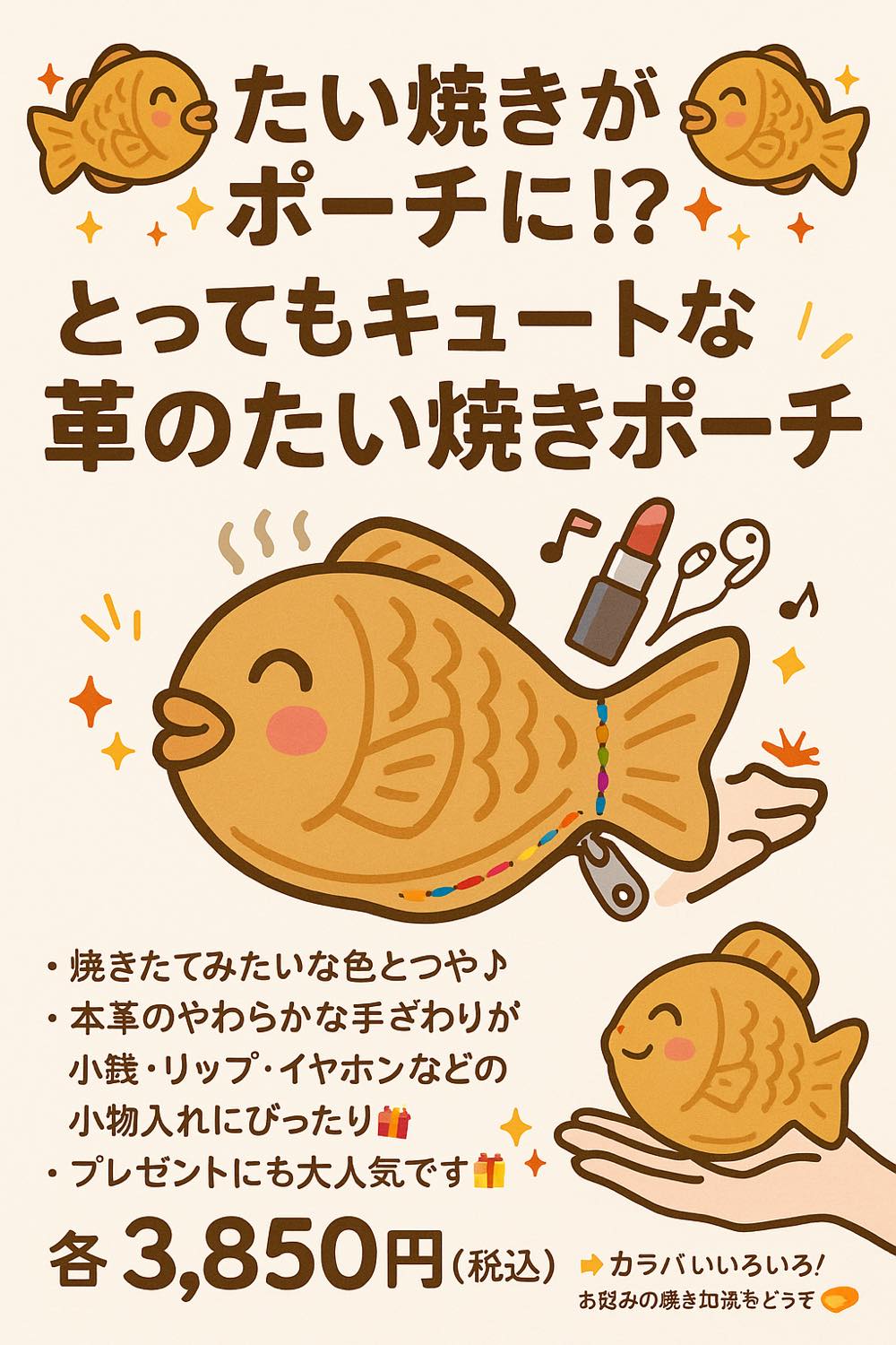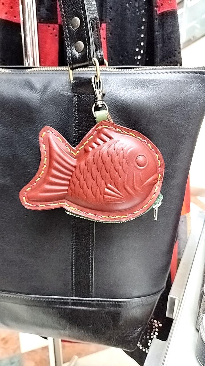 本物そっくりのとてもキュートな革のたい焼きポーチです。イヤホンや化粧品、小銭などを入れて、バックに付けて下さいね。