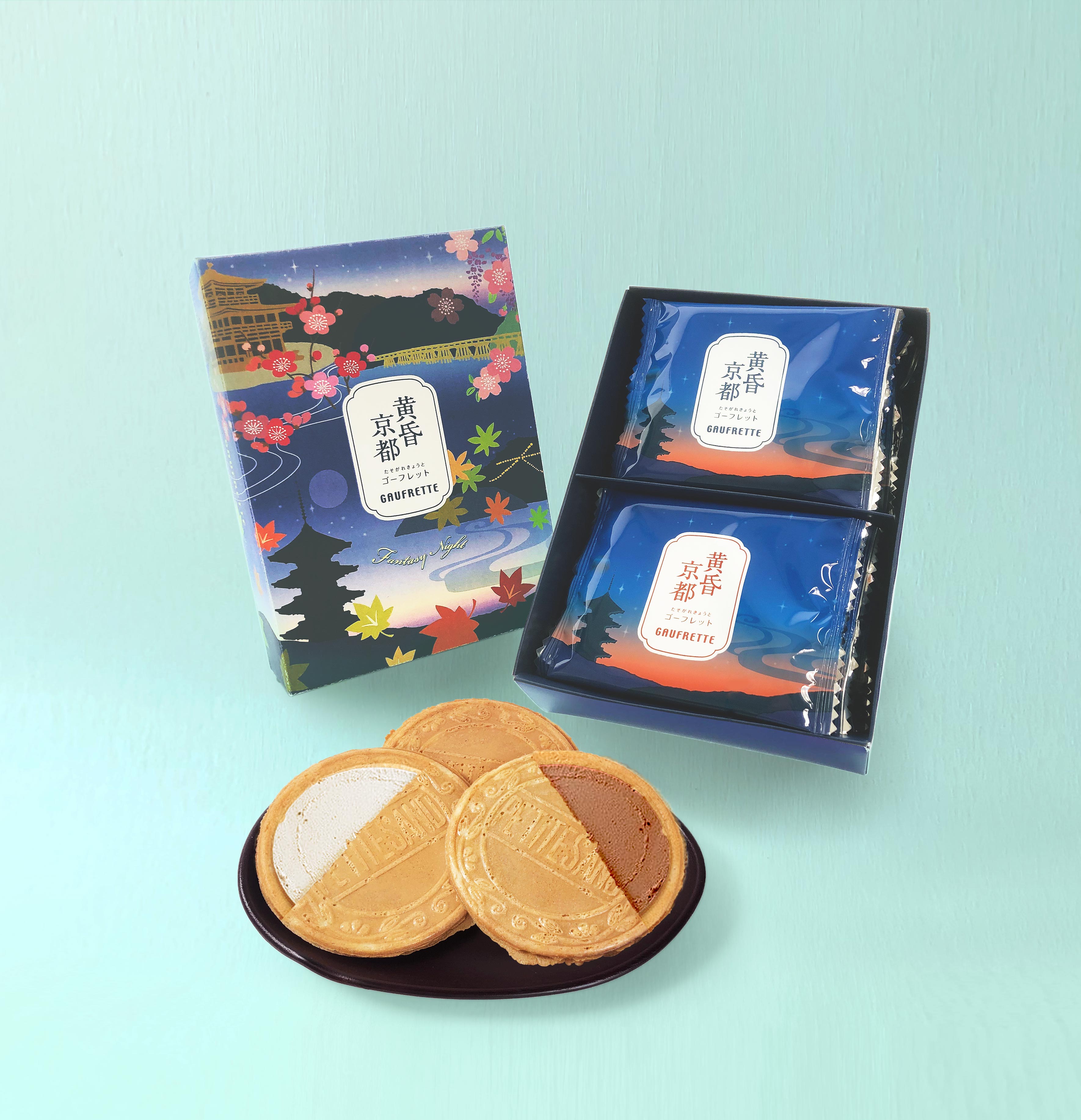 どなた様にも好評な「バニラクリーム」と「チョコレートクリーム」をサンドした、軽やかな口触りのお菓子です。ご家族団欒の「珈琲・紅茶・緑茶」のお供に仕立、個包装されていますのでお土産にも好適品です。子供さんからシニアのご家庭まで、どちら様にもご好評、間違いなしのゴーフル菓子です。
